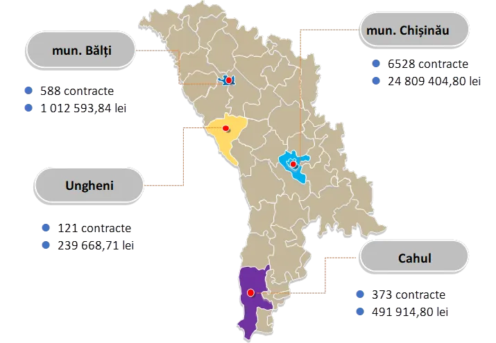 Cele mai mari încasări la impozitul pe venit din locațiunea bunurilor imobile au fost înregistrate în municipiul Chișinău, unde au fost raportate 6.528 de contracte și încasări de 24.809.404,80 lei. Pe următoarele poziții se află municipiul Bălți, cu 588 de contracte și 1.012.593,84 lei, Cahul, cu 373 de contracte și 491.914,80 lei, și Ungheni, cu 121 de contracte și 239.668,71 lei.