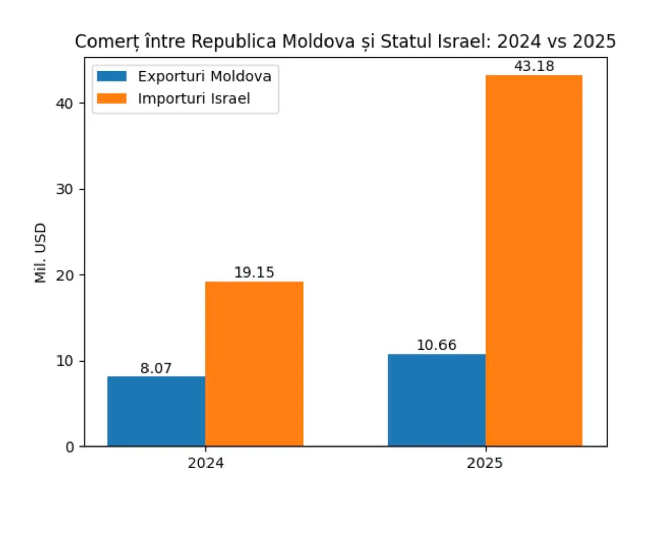 Volumul schimburilor comerciale dintre Republica Moldova și Statul Israel a crescut semnificativ în 2025, ajungând la 53,84 milioane de dolari, față de 27,22 milioane de dolari în 2024.