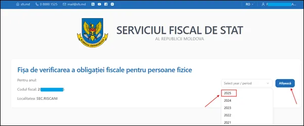 De asemenea, contribuabilii pot verifica existența obligației de achitare a impozitului pe venit la oricare Direcție deservire fiscală ori prin intermediul Portalului guvernamental al cetățeanului (https://evo.gov.md), în rubrica „Situația fiscală”, la fel poate fi verificată existența restanțelor față de buget.