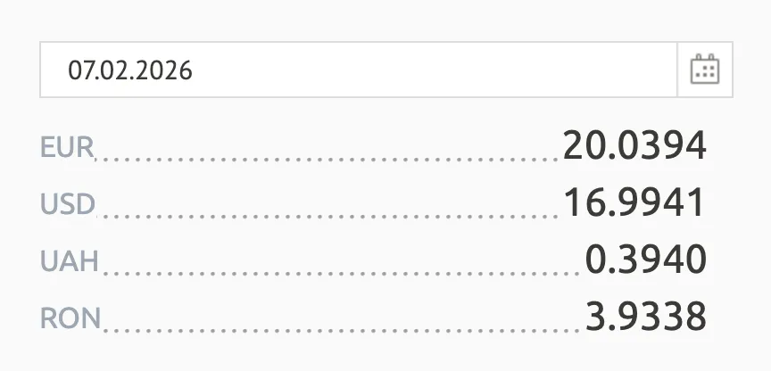 Banca Națională a Moldovei (BNM) a stabilit datele oficiale de schimb valutar pentru astăzi, 7 februarie 2026.