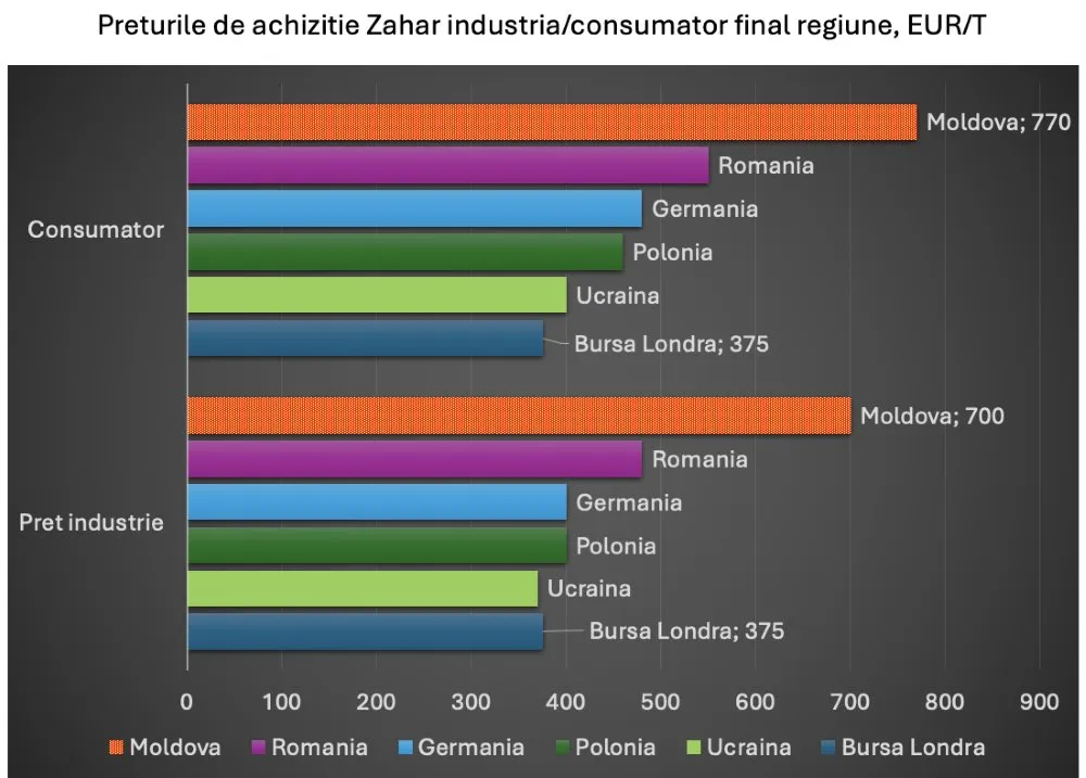 Pe piața angro din Moldova, prețul actual al zahărului se menține la 15–16 lei/kg, iar în retail — nu mai puțin de 18 lei/kg. Adică, consumatorii casnici și, mai important, consumatorii industriali de zahăr din Moldova plătesc pentru acest produs (și pentru componenta sa în producția alimentară) de 1,5–2 ori mai mult decât în țările vecine și, în general, în Uniunea Europeană.