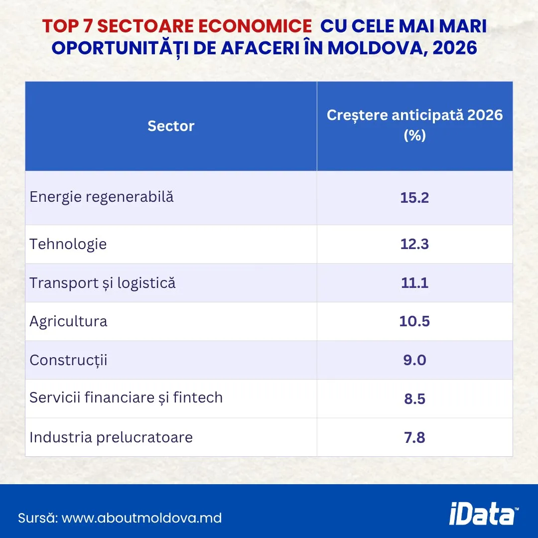 Energia regenerabilă și sectorul tehnologic sunt domeniile cu cele mai mari perspective de creștere în Republica Moldova în 2026. Potrivit unei analize iData, energia regenerabilă ocupă primul loc în clasament, cu o creștere anticipată de 15,2%, fiind urmată de tehnologie (12,3%) și transport și logistică (11,1%).