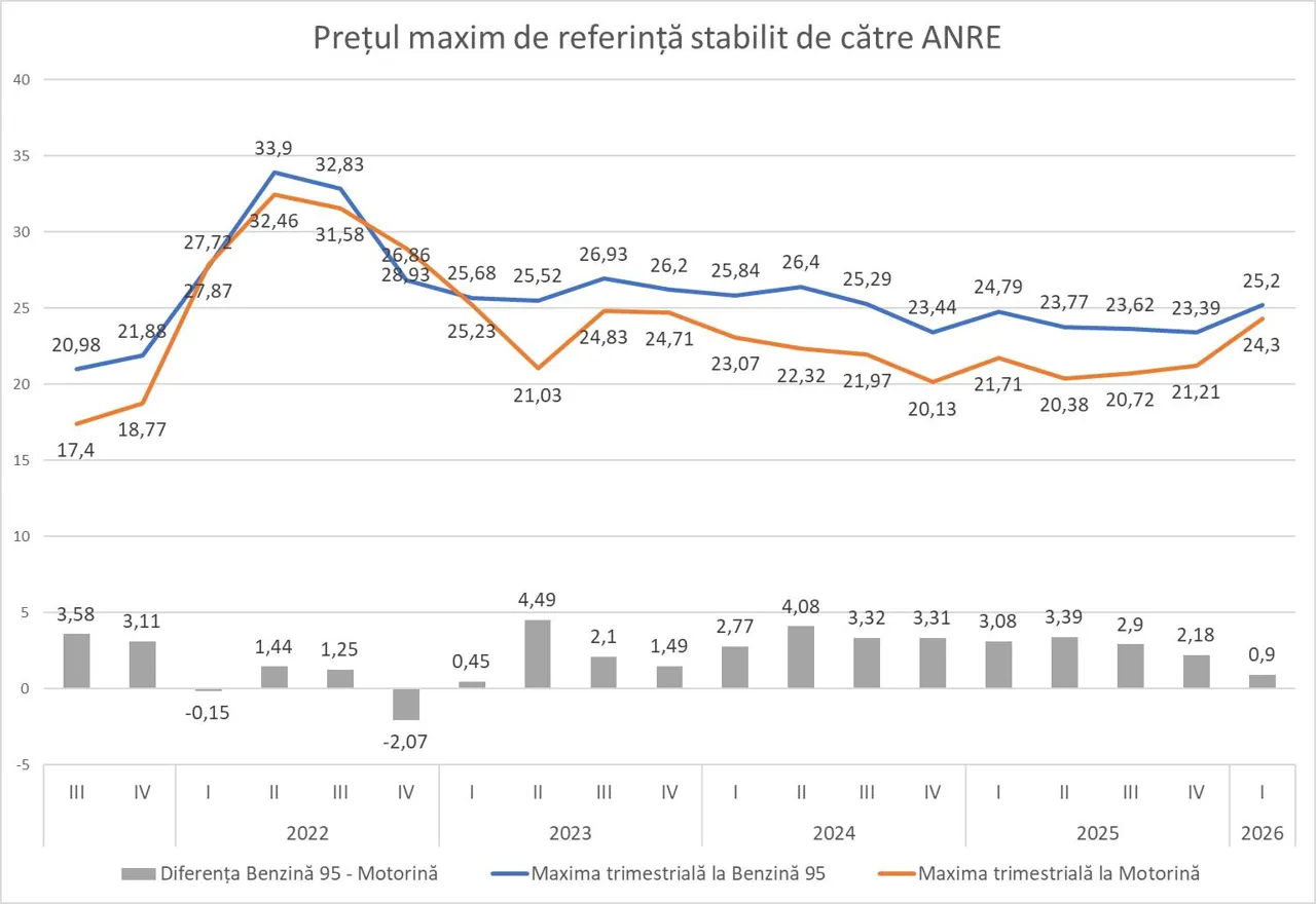 Datele stabilite de Agenția Națională pentru Reglementare în Energetică (ANRE) pentru următoarea zi arată că diferența dintre cele două tipuri de carburanți s-a redus considerabil. Astfel, benzina A95 costă 25,2 lei pe litru, iar motorina – 24,3 lei pe litru.
