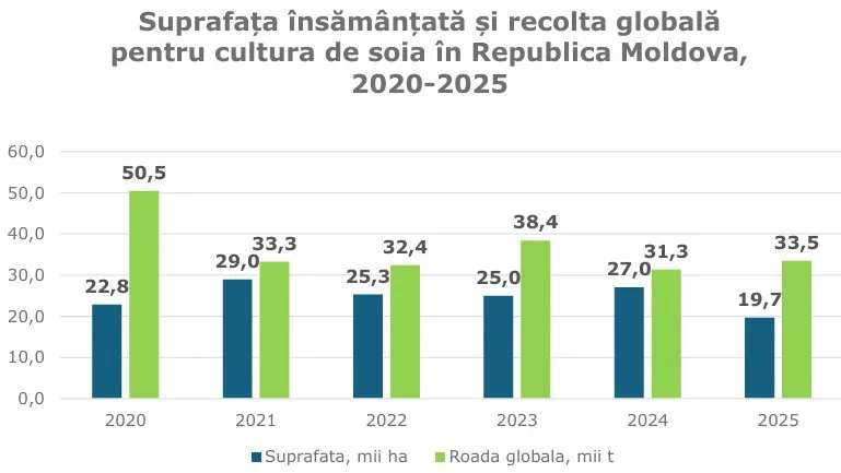 De pe circa 40% din suprafețele semănate cu soia în anul 2025, nu s-a reușit a strânge recolta de boabe. De vină au fost umiditatea ridicată și condițiile meteo nefavorabile din toamna anului trecut.