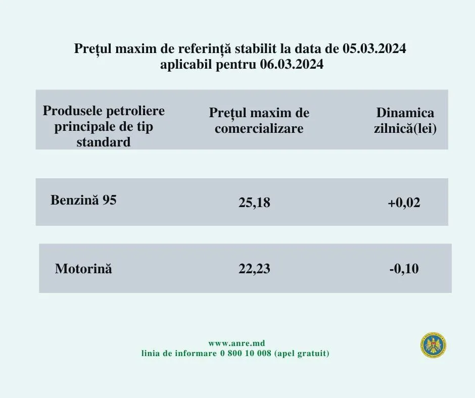 Agenția Națională pentru Reglementare în Energetică (ANRE) a stabilit prețurile maxime de referință pentru produsele petroliere principale de tip standard pentru mâine, 6 martie.