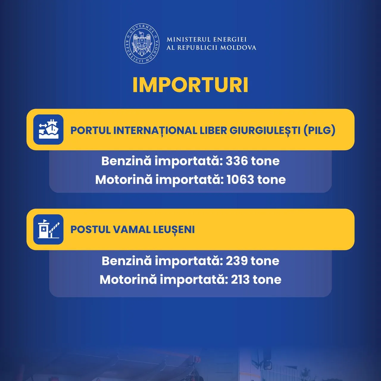 Totodată, prin postul vamal Leușeni au intrat în țară 239 de tone de benzină și 213 tone de motorină.