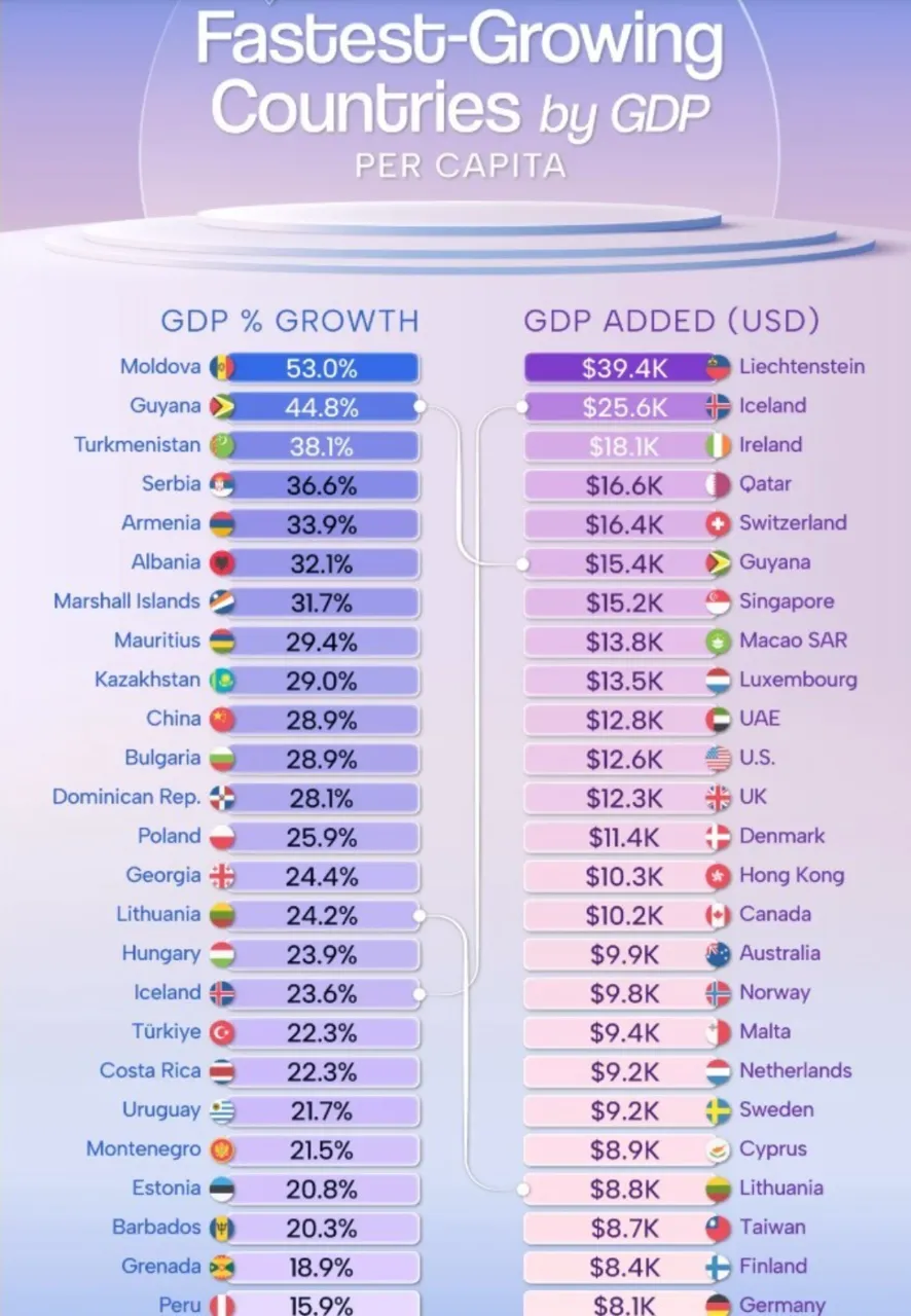 Economiile emergente domină clasamentul creșterilor procentuale. Republica Moldova conduce topul, cu o majorare estimată de 53% în intervalul analizat. În același clasament se regăsesc mai multe state din Europa de Est și Sud-Est, inclusiv Serbia, Albania, Bulgaria, Polonia, Lituania și Estonia, în timp ce România nu apare în top.