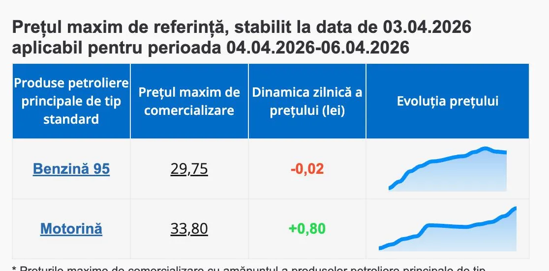 Agenția Națională pentru Reglementare în Energetică (ANRE) a stabilit noile prețuri maxime de referință la carburanți, valabile pentru perioada 4–6 aprilie 2026.