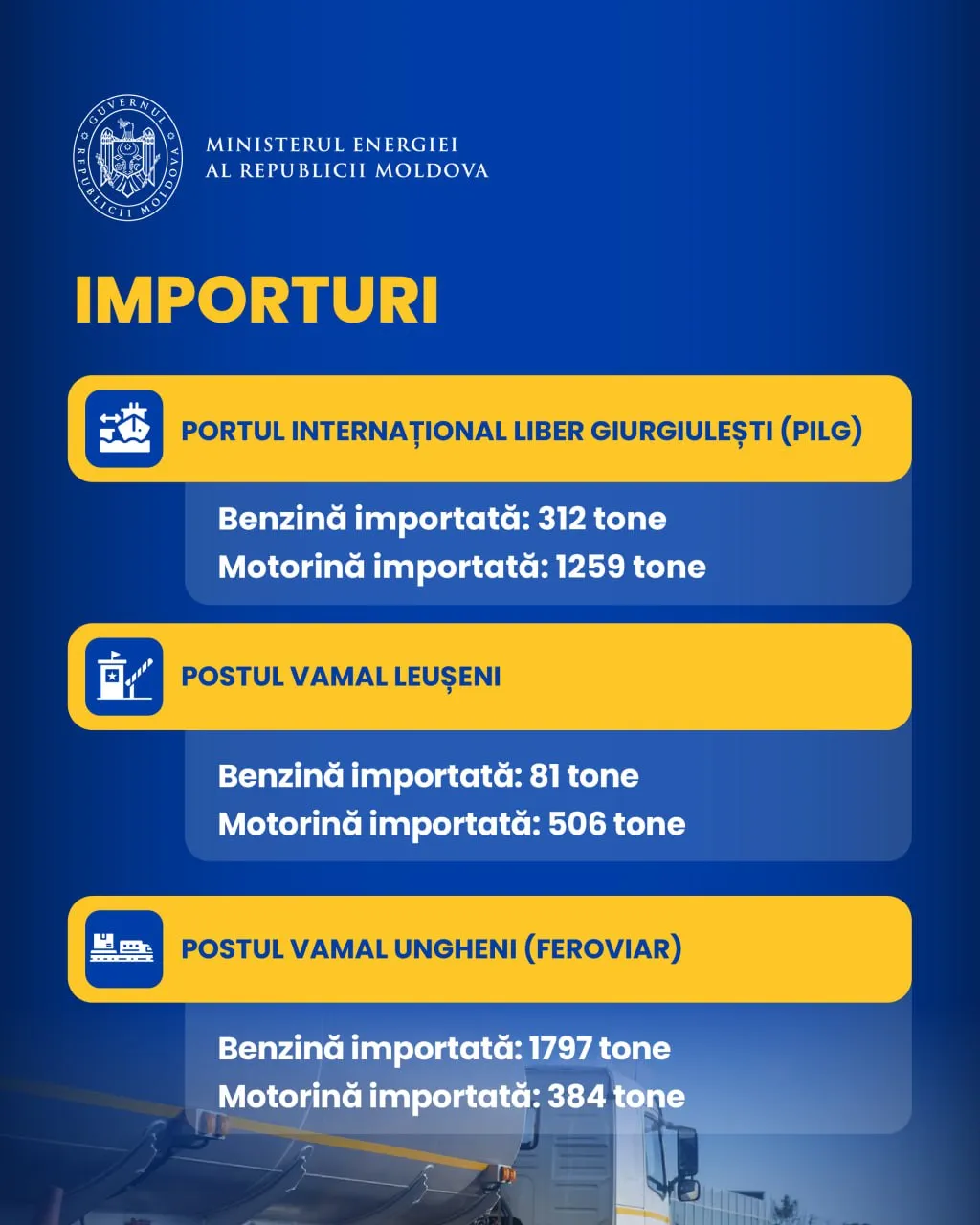 Imagine simbolMinisterul Energiei anunță că importurile au fost realizate atât prin Portul Internațional Liber Giurgiulești, cât și cu cisterne auto și feroviare prin punctele vamale Leușeni și Ungheni, transmite Știri.md.