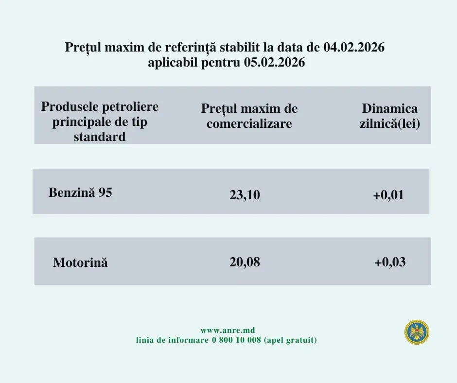 Agenția Națională pentru Reglementare în Energetică (ANRE) a stabilit prețurile maxime de referință pentru produsele petroliere principale de tip standard pentru mâine, 5 februarie.