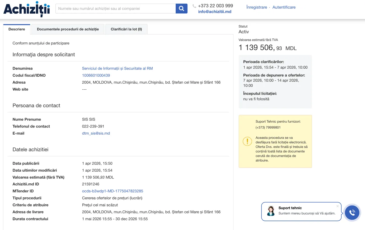 Actele pentru licitație vor fi depuse până pe 14 aprilie. Durata indicată a contractului este 1 mai – 31 decembrie 2026, se arată pe Portalul Național de Achiziții.