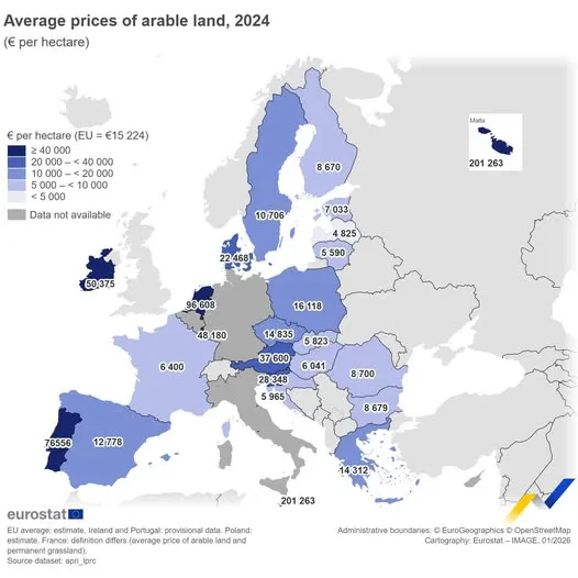 Cele mai scumpe terenuri agricole din UE se află în Malta, unde un hectar ajunge la 201.263 de euro, urmată de Țările de Jos cu 96.608 euro și Portugalia cu 76.556 euro pe hectar. La polul opus, cele mai mici prețuri se înregistrează în Letonia (4.825 euro/ha), Lituania (5.590 euro/ha) și Slovacia (5.823 euro/ha).