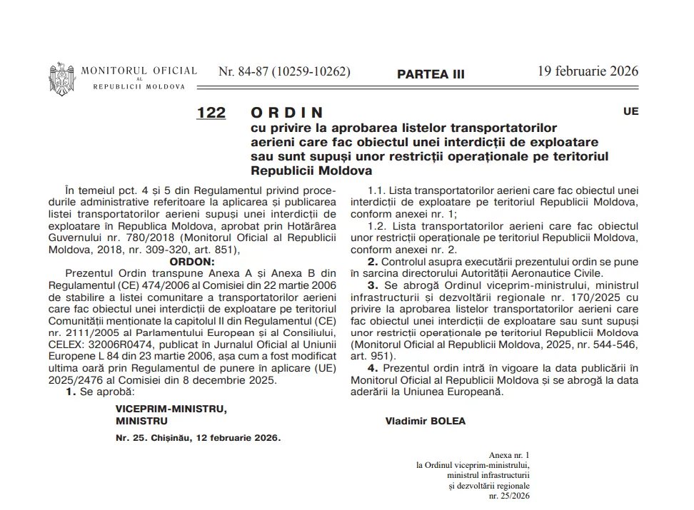 Guvernul Republicii Moldova a adoptat un ordin prin care aprobă listele actualizate ale transportatorilor aerieni care fie nu pot opera pe teritoriul Republicii Moldova, fie sunt supuși unor restricții operaționale. Documentul, semnat de vicepremierul Vladimir Bolea, ministru al Infrastructurii și Dezvoltării Regionale, a intrat în vigoare pe 19 februarie, la data publicării în Monitorul Oficial și va rămâne în vigoare până la aderarea Republicii Moldova la Uniunea Europeană.