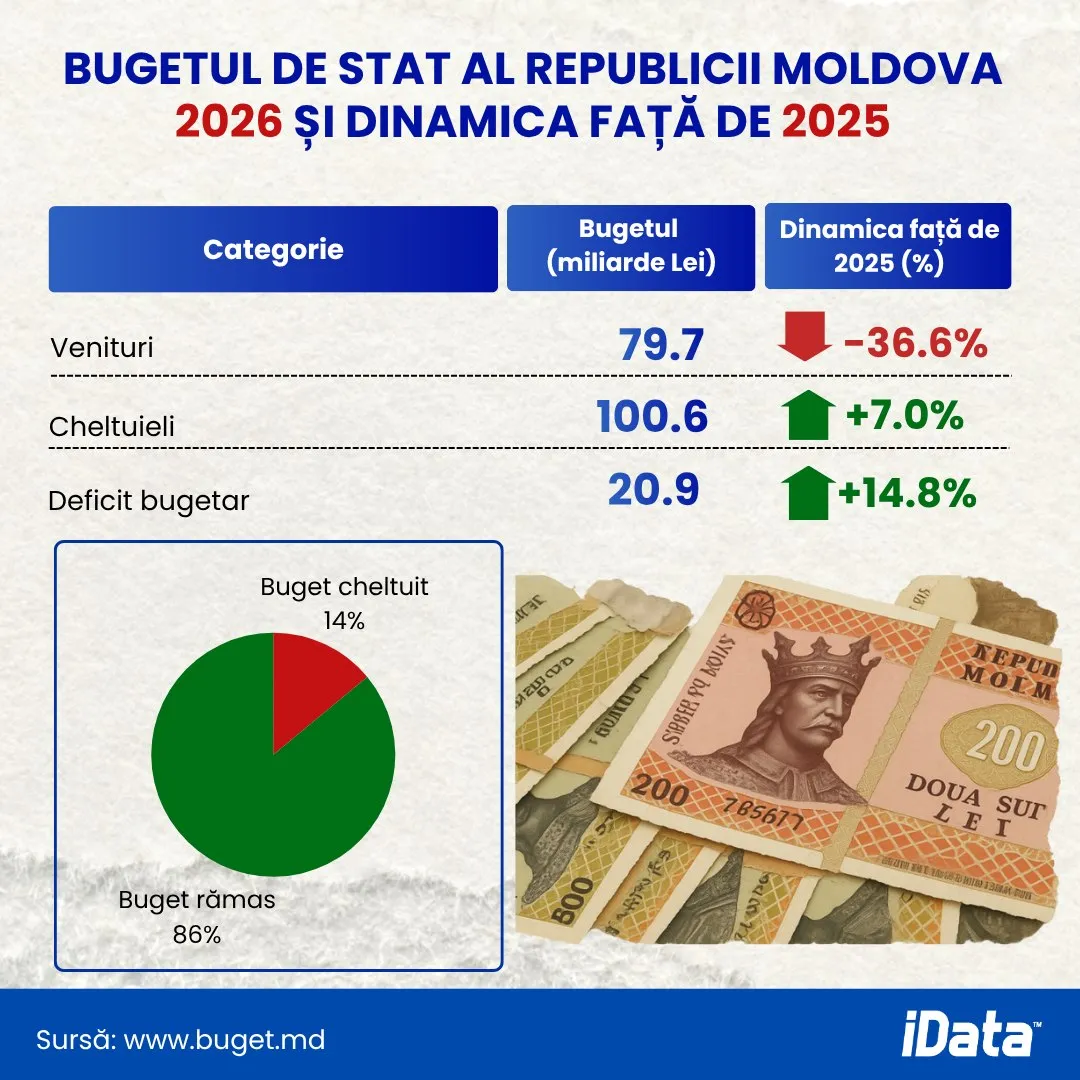 Imagine simbolPotrivit cifrelor prezentate de iData, veniturile bugetare sunt estimate la 79,7 miliarde de lei, în scădere cu 36,6% față de anul precedent. În același timp, cheltuielile ajung la 100,6 miliarde de lei, marcând o creștere de 7%, transmite Știri.md.