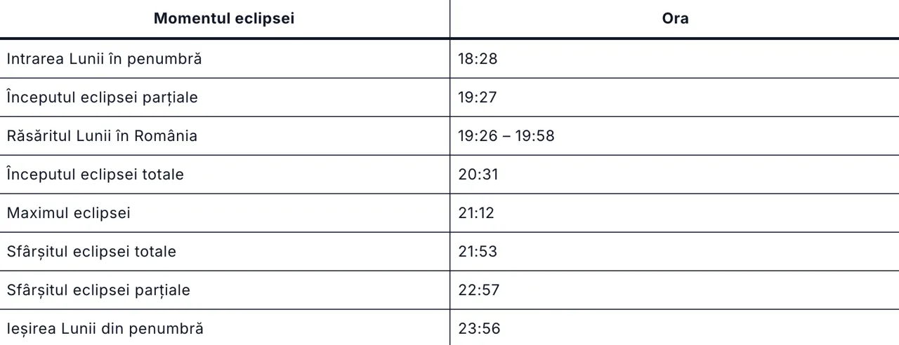 „Fenomenul începe cu intrarea Lunii în penumbră, la ora 18:28, când Luna va fi sub orizont. Pentru că penumbra Pământului nu este foarte opacă, la începutul fenomenului culoarea Lunii nu se va schimba mult. La București, Luna va răsări la ora 19:37, când deja se află în umbra Pământului”, reiese din informațiile publicate pe astro-urseanu.ro.