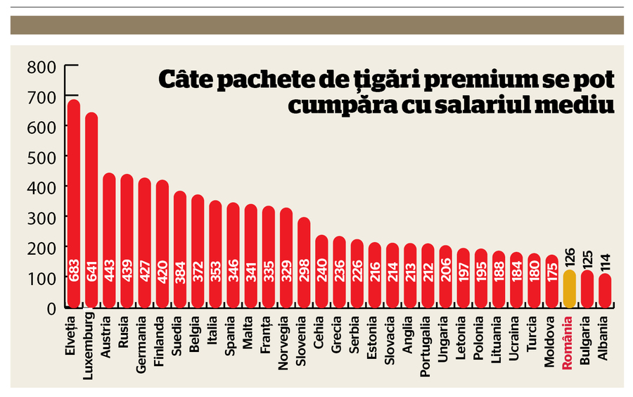 Moldovenii pot cumpăra 175 de pachete de ţigări, cu 50 mai mai multe decât românii şi bulgarii. În Republica Moldova, preţul unui pachet de ţigări premium este foarte mic prin comparaţie cu ţările din UE, dar dacă ne referim la puterea de cumpărare şi la timpul de muncă necesar pentru achiziţia aceluiaşi pachet, suntem la coada clasamentului, unde doar România, Bulgaria şi Albania stau mai rău.