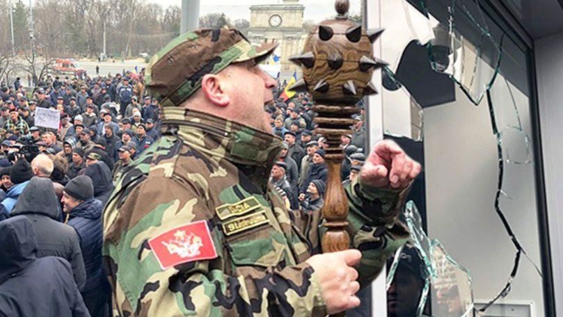 Colaj: știri.mdÎn timpul acțiunii, unul dintre protestatari a spart ușa centrală a clădirii cu un buzdugan, transmite Știri.md cu referire la Zdg.md.
