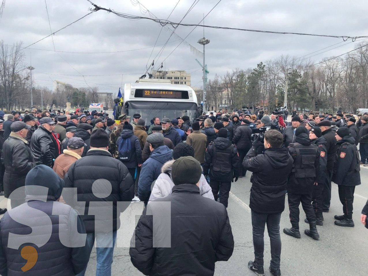 Inițial, veteranii au închis o porțiune de drum, astfel încât câteva troleibuze au fost nevoite să staționeze în PMAN, transmite Știri.md.