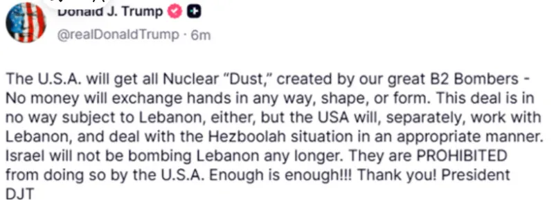 Într-un mesaj suplimentar, liderul american a afirmat că Israel nu va mai efectua atacuri asupra Libanului, susținând că o astfel de acțiune este „interzisă” de Statele Unite. „Le este interzis să facă acest lucru de către SUA. Ajunge”, a scris acesta.