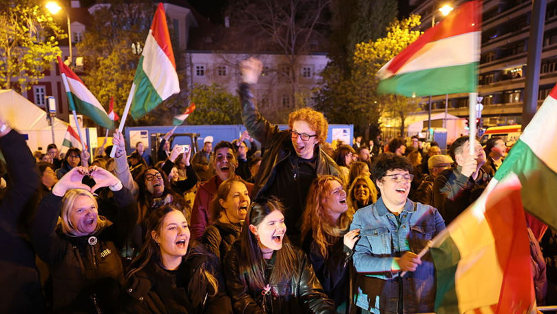 Budapesta s-a transformat într-o arenă de petrecere până în primele ore ale zilei de luni, oamenii dansând în faţa barurilor şi maşinile claxonând, în timp ce susţinătorii partidului de opoziţie Tisza sărbătoreau victoria.