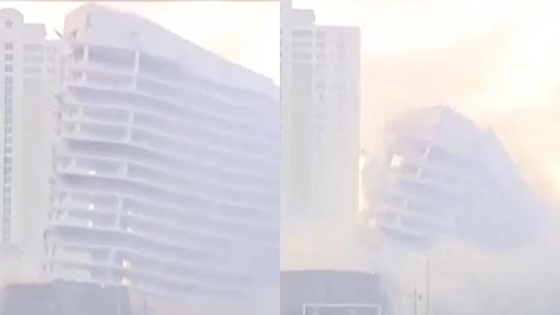 Prăbușirea a început lent. Fum albastru și roz a început să iasă în valuri de la partea superioară a clădirii, urmat de explozii, în timp ce toate etajele s-au prăbușit în mai puțin de 20 de secunde.