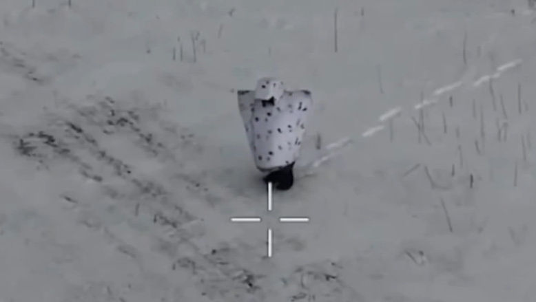 Înregistrările video publicate de militarii ucraineni surprind un soldat rus într-o ținută de camuflaj albă, voluminoasă, în formă de pinguin, deplasându-se greoi pe un câmp acoperit de zăpadă înainte de a fi lovit de o dronă ucraineană.