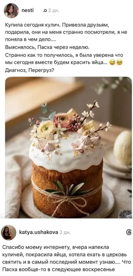 Oamenii au început, de asemenea, să împărtășească povești despre cum au aflat de greșeala lor: unii s-au confruntat cu reacția surprinsă a prietenilor, alții și-au dat seama de eroare cu câteva minute înainte de a merge la biserică pentru a sfinți pasca.