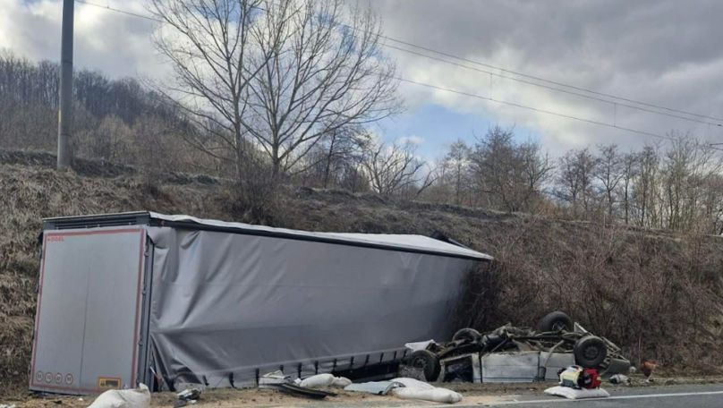 Șoferul TIR-ului a reușit să iasă singur din cabină și a fost transportat la spital, cu o lovitură la cap. Traficul în zonă fost complet blocat.