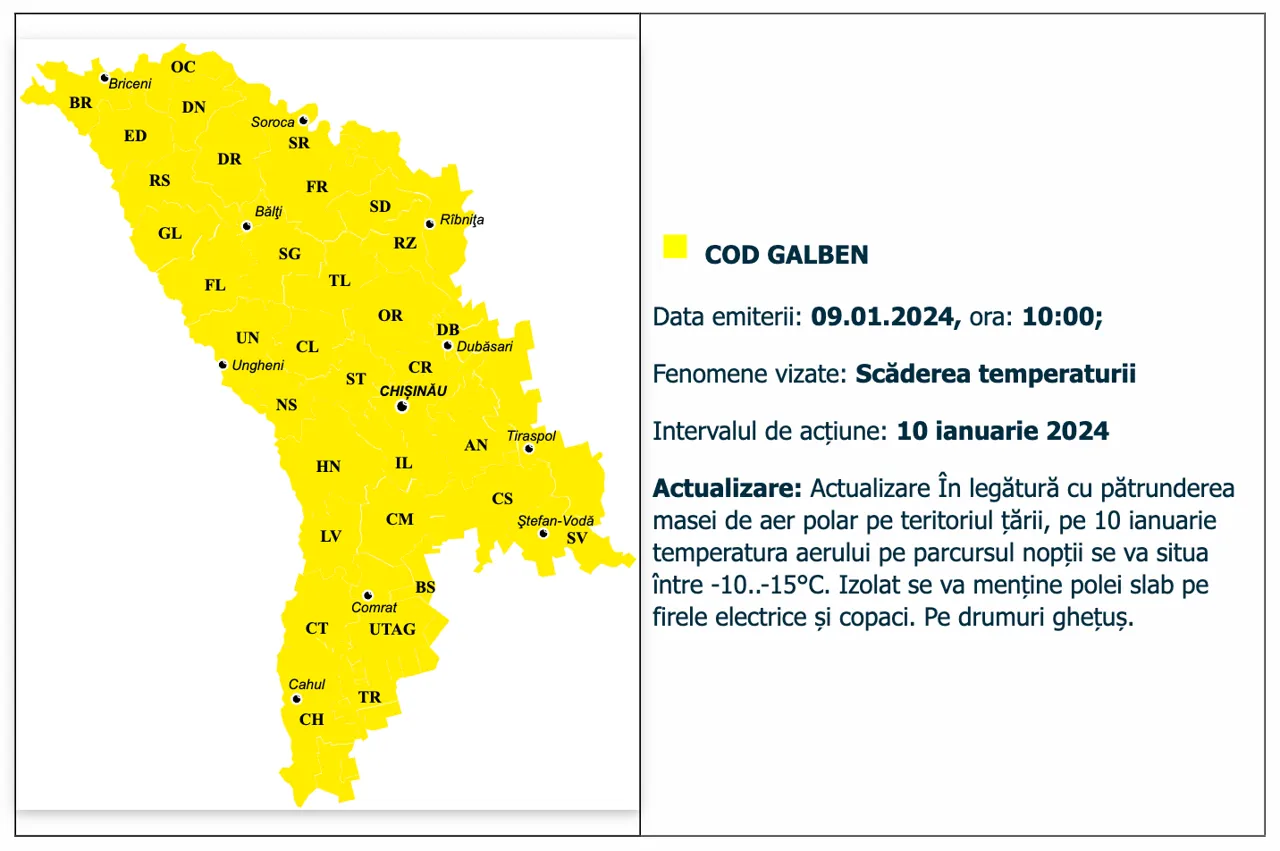 În legătură cu pătrunderea masei de aer polar pe teritoriul țării, Serviciul Hidrometeorologic de Stat a emis Cod Galben de scădere a temperaturii.