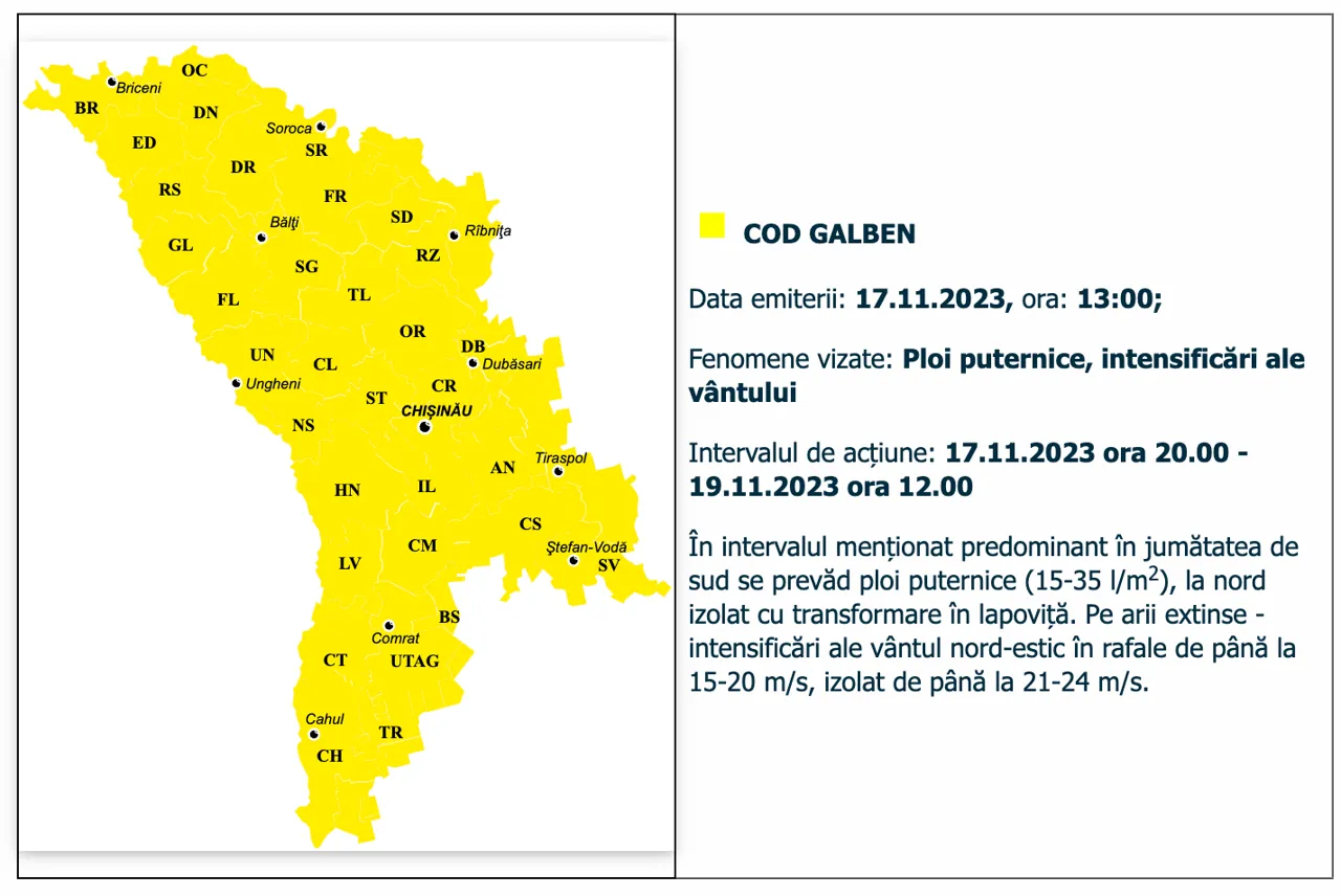Codul Galben este valabil pentru perioada 17-19 noiembrie, transmite Știri.md.