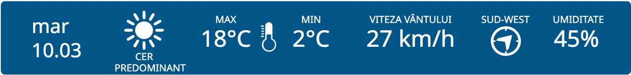 Vom avea parte de o zi predominant însorită, potrivit prognozei meteorologilor. Maximele termice vor varia între +13 și +18 grade Celsius.