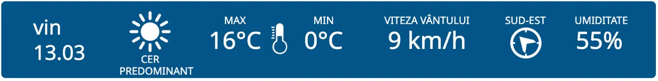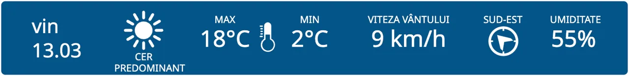 Astăzi vom avea parte de cer predominant însorit pe întreg teritoriul țării. Maximele termice vor varia între +13 și +18 grade, iar cele minime între -3 și +2 grade Celsius.