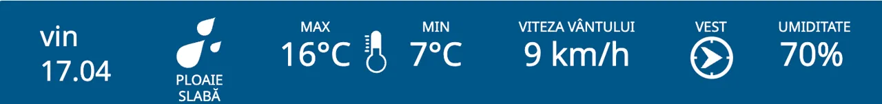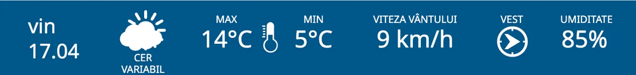 Meteorologii prognozează pentru vineri, 17 aprilie, ploi slabe în centrul R. Moldova, iar în sudul și nordul țării - cer variabil. Maximele termice vor fi cuprinse între 14 și 17 grade Celsius.