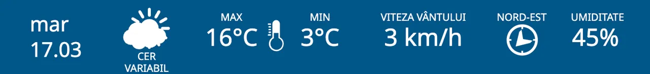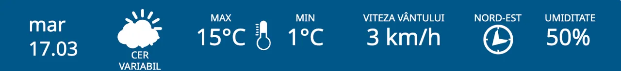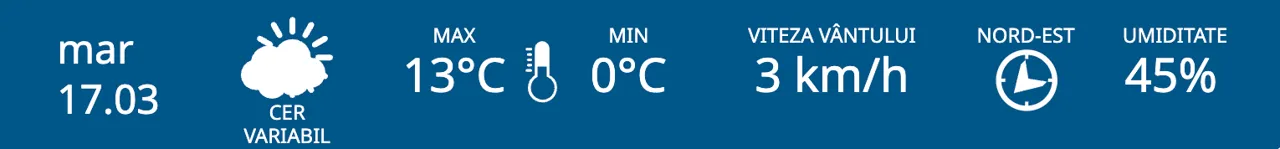 Meteorologii prognozează pentru marți, 17 martie, cer variabil pe întreg teritoriul R. Moldova. Maximele termice vor fi cuprinse între 13 și 16 grade Celsius.