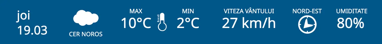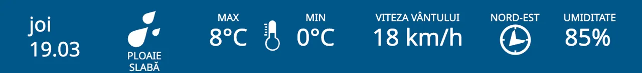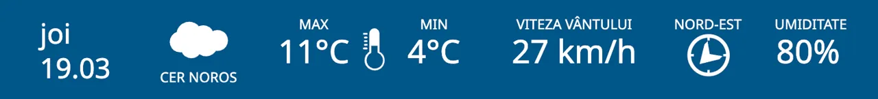 Meteorologii prognozează pentru joi, 19 martie, ploi slabe în nordul R. Moldova, iar în centrul și sudul țării - cer noros. Maximele termice vor fi cuprinse între 8 și 11 grade Celsius.