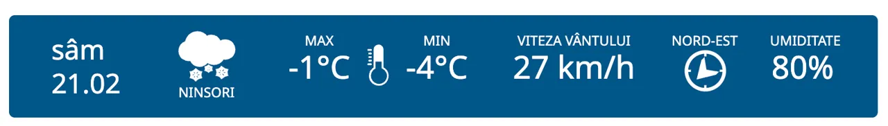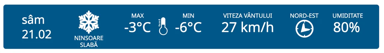 Temperaturile rămân negative în toate regiunile Republicii Moldova pe 21 februarie. În nord va fi cer noros, în centru și în municipiul Chișinău sunt prognozate ninsori slabe, iar în sud – ninsori. Vântul va sufla din nord-est cu 27 km/h.