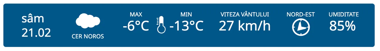Imagine simbolÎn nordul țării, maxima zilei va fi de -6°C, iar minima va coborî până la -13°C. Cerul va fi noros, iar umiditatea aerului va ajunge la 85%, transmite Știri.md.![]()