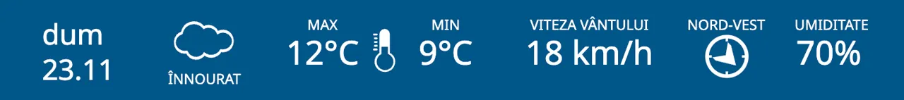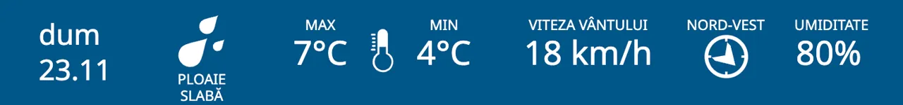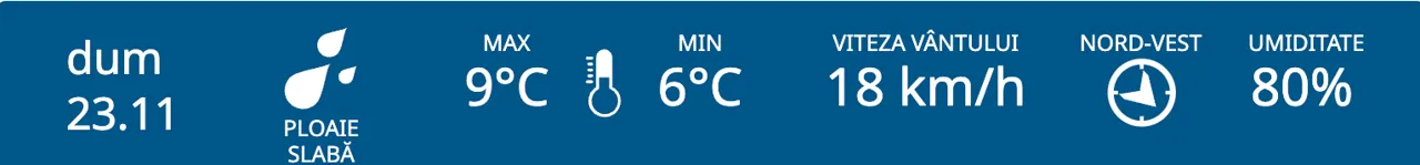 Meteorologii prognozează pentru duminică, 23 noiembrie, ploi slabe în nordul și centrul R. Moldova, iar în sud - cer noros. Maximele termice vor fi cuprinse între +7 și +12 grade Celsius.