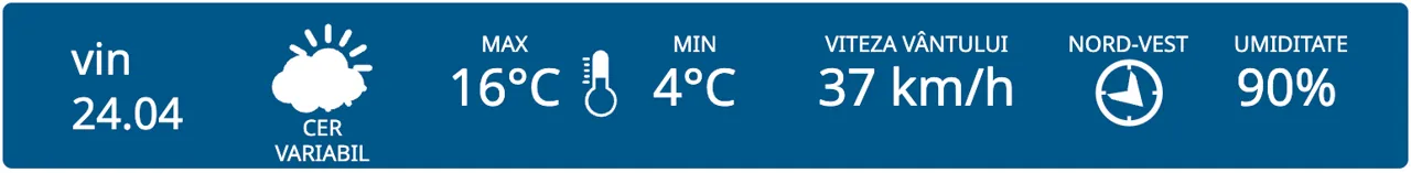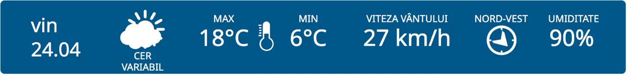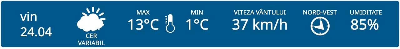 Pentru vineri, meteorologii prognozează cer variabil în toată țara. Maximele termice vor varia între +13 și +18 grade, iar cele minime între +1 și +6 grade Celsius.