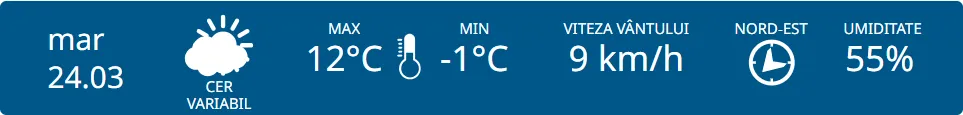 Meteorologii prognozează pentru astăzi cer variabil pe întreg teritoriul țării. Maximele termice vor varia între +12 și +17 grade, iar cele minime între -1 și +4 grade Celsius.