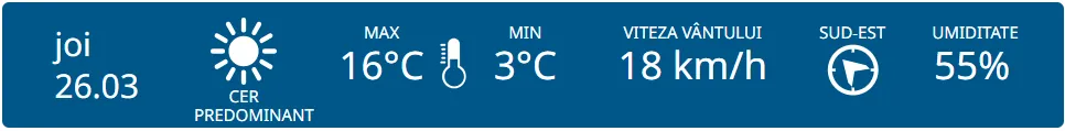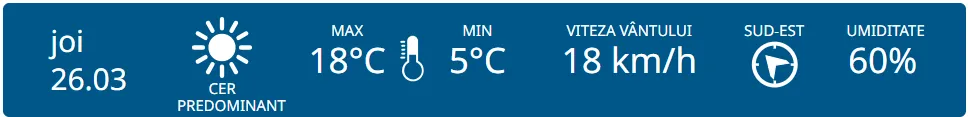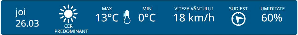 Meteorologii prognozează cer predominant însorit astăzi. Maximele termice vor varia între +13 și +18 grade, iar cele minime între 0 și +5 grade Celsius.