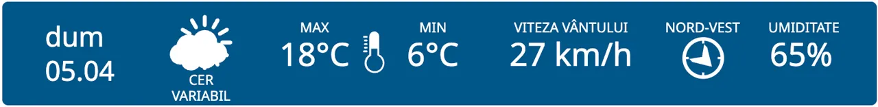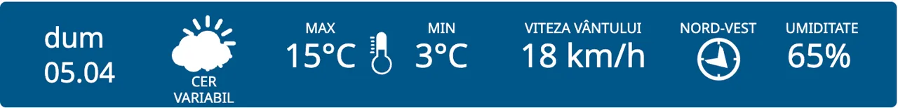 Duminică vom avea parte de cer variabil. Maximele termice vor varia între +15 și +20 de grade, iar cele minime între +3 și +8 grade Celsius.