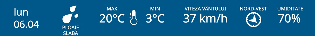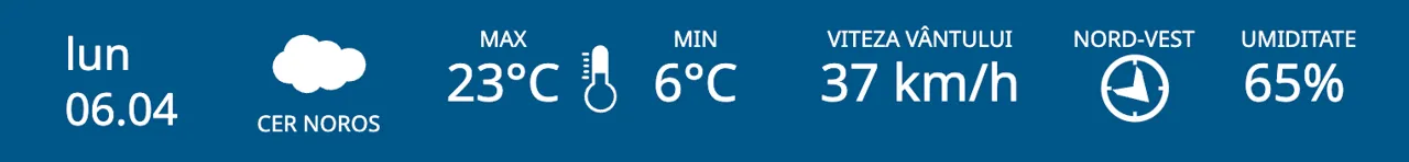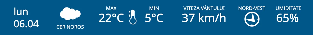 Imagine simbolPotrivit Serviciului Hidrometeorologic de Stat (SHS), vântul va sufla din nord-vest și va avea o viteză maximă de până la 37 km/h. Umiditatea aerului va fi de până la 70%, transmite Știri.md.