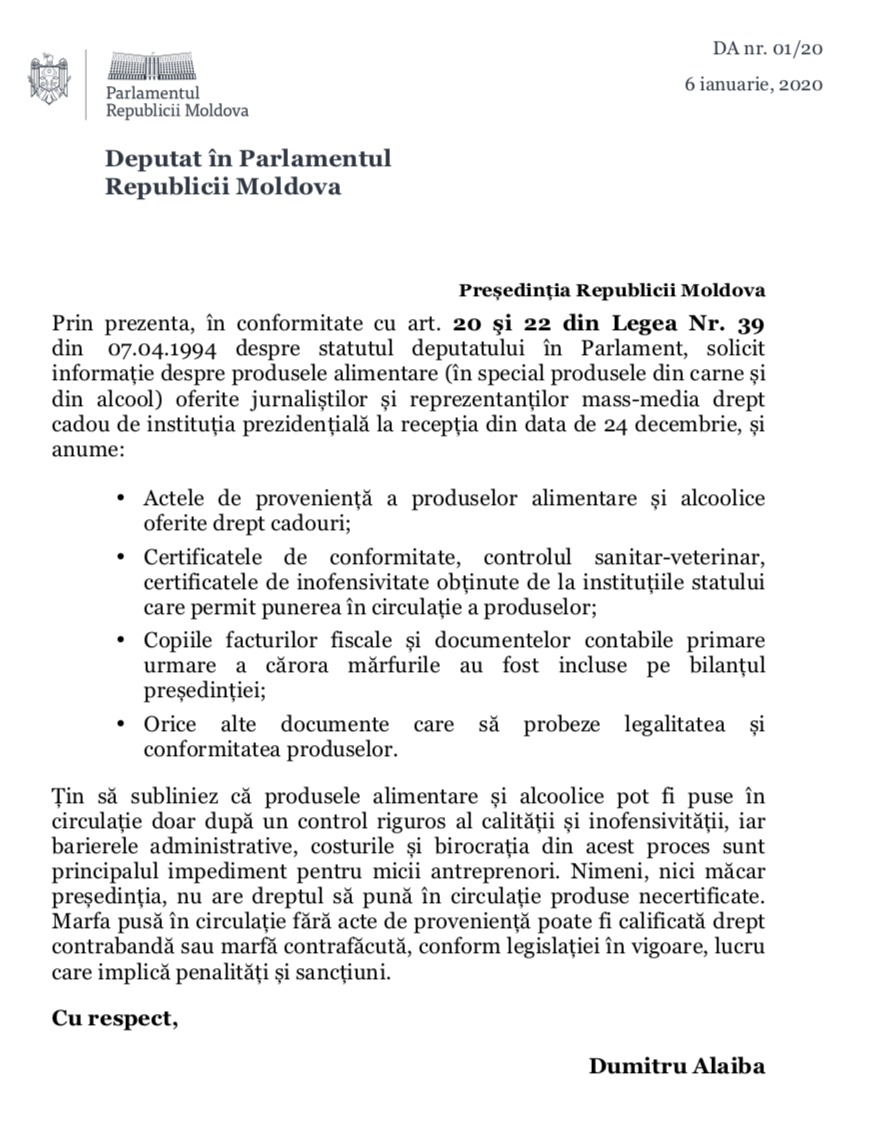 Deputatul Dumitru Alaiba solicită Președinției acte ce ar confirma proveniența și calitatea produselor oferite drept cadou jurnaliștilor la evenimentul organizat de șeful statului, Igor Dodon, la 24 decembrie.