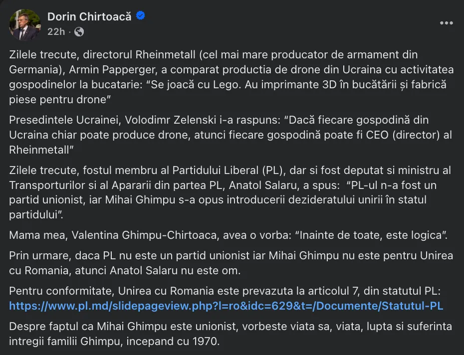 Fostul primar al Chișinăului și ex-lider al Partidului Liberal, Dorin Chirtoacă, a reacționat dur după declarațiile lui Anatol Șalaru despre trecutul PL și poziția lui Mihai Ghimpu față de Unirea cu România. Într-o postare publicată pe rețelele sociale, Chirtoacă a respins afirmațiile fostului său coleg de partid și a susținut că statutul formațiunii conține explicit obiectivul unirii.