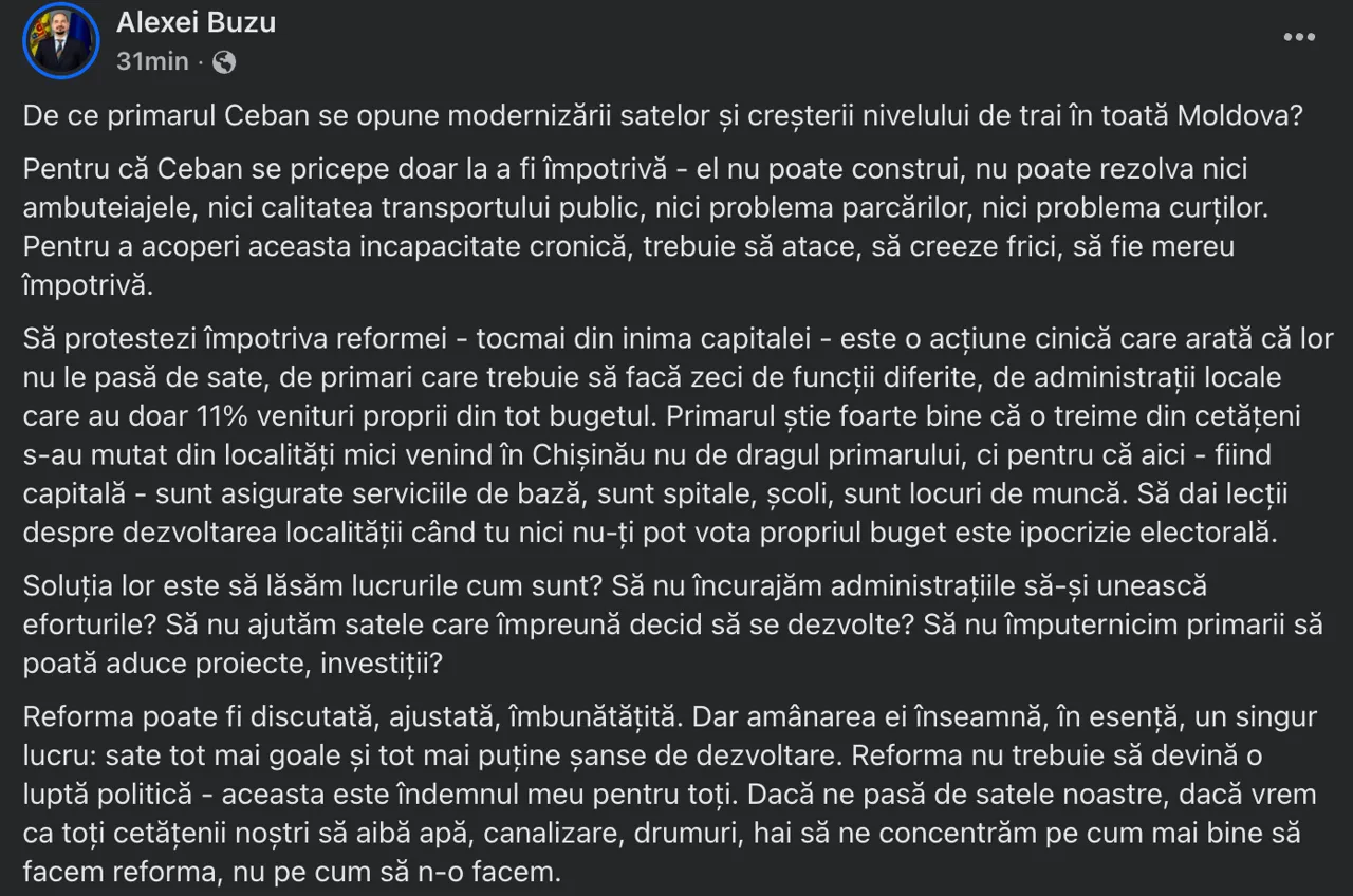 „Să protestezi împotriva reformei – tocmai din inima Capitalei – este o acțiune cinică ce arată că lor nu le pasă de sate”, a afirmat Buzu, adăugând că multe administrații locale se confruntă cu resurse limitate și responsabilități extinse.