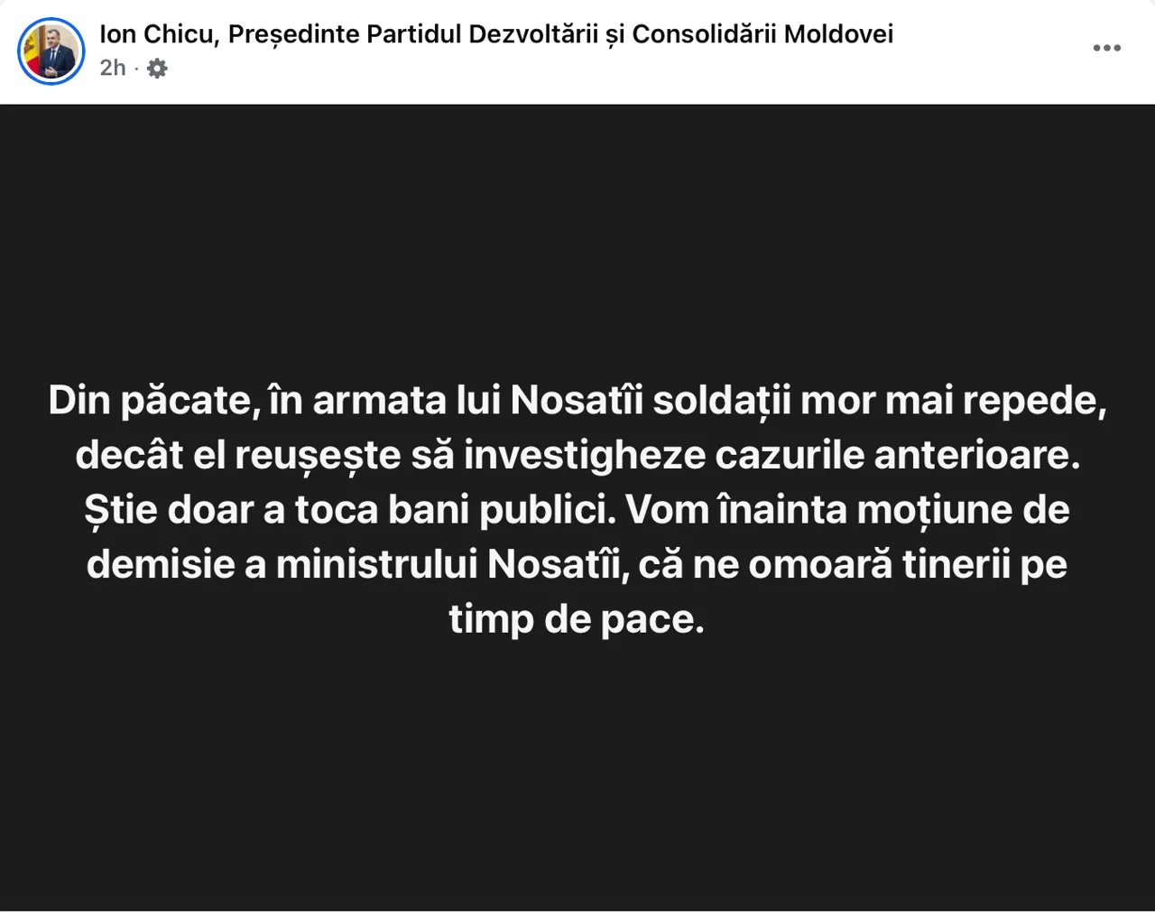 „Din păcate, în armata lui Nosatîi soldații mor mai repede, decât el reușește să investigheze cazurile anterioare. Știe doar a toca bani publici. Vom înainta moțiune de demisie a ministrului Nosatîi, că ne omoară tinerii pe timp de pace”, a scris Chicu pe rețelele de socializare.