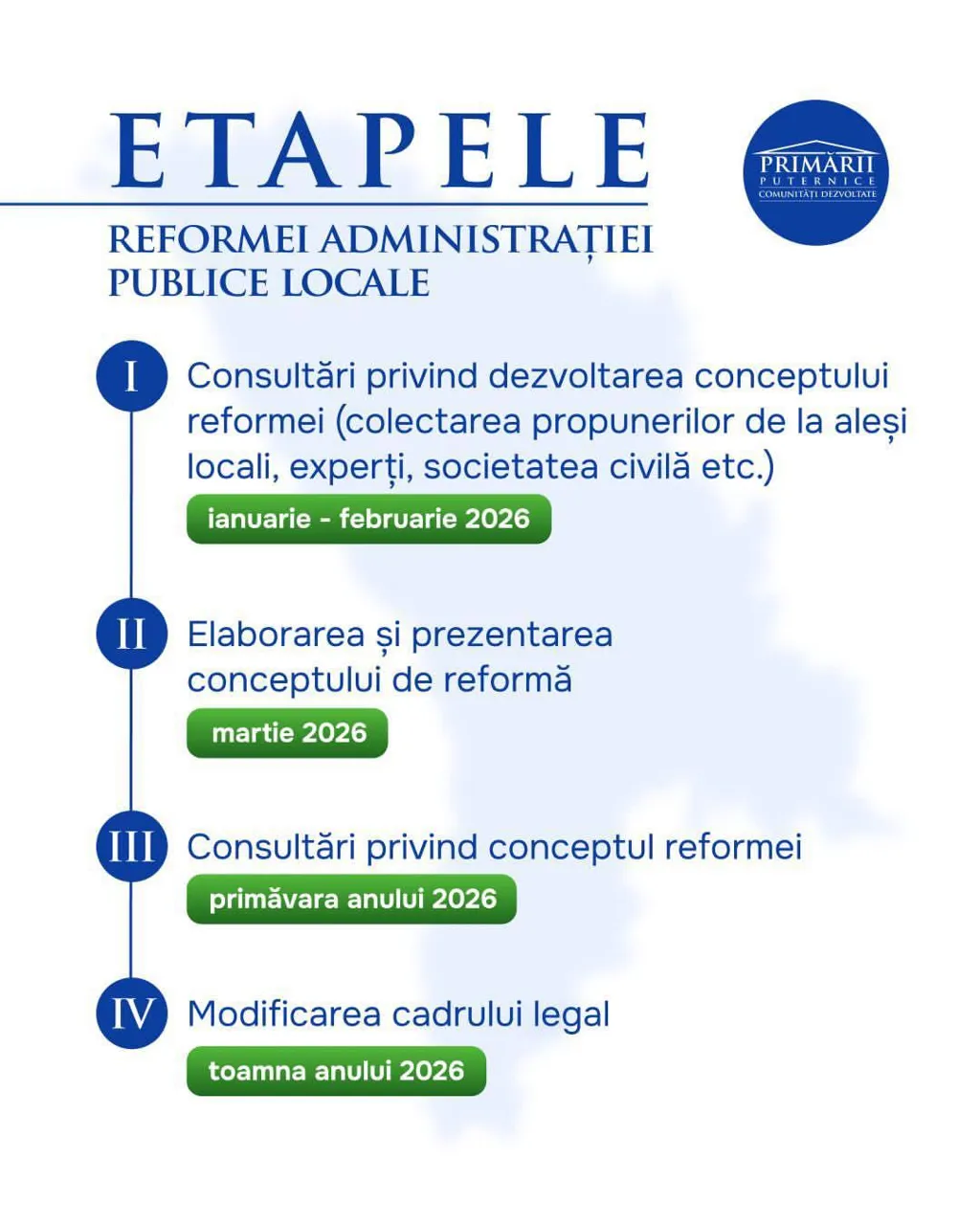 În prima săptămână din luna martie, vor fi consultați locuitorii din Leova, Bălți, Fălești, Ungheni. Tot în luna martie urmează să fie prezentat conceptul reformei, care va fi consultat pe larg cu toate părțile interesate. Doar în urma consultărilor va fi aprobat conceptul final și elaborat pachetul legislativ pentru a fi prezentat toamna Parlamentului.