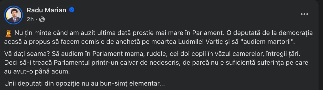 „Nu țin minte când am auzit ultima dată prostie mai mare în Parlament. O deputată de la democrația acasă a propus să facem comisie de anchetă pe moartea Ludmilei Vartic și să „audiem martorii”.