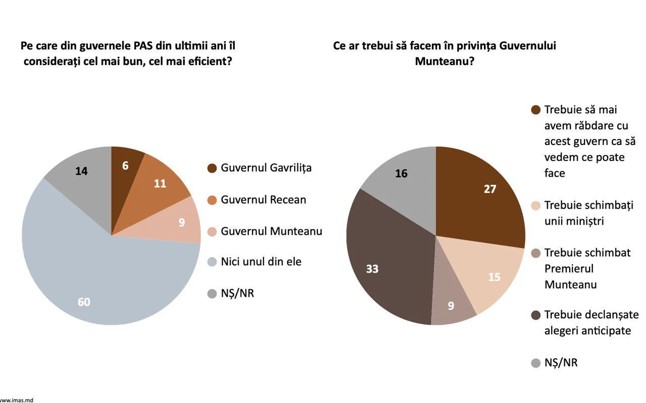 Fiind întrebați pe care dintre guvernele PAS din ultimii ani îl consideră cel mai eficient, 60% dintre respondenți au spus „niciunul”. Alți 14% dintre cei intervievați au fost indeciși, în timp ce 11 la sută au numit Guvernul Recean, nouă la sută au spus Guvernul Munteanu și 6% - Guvernul Gavrilița.